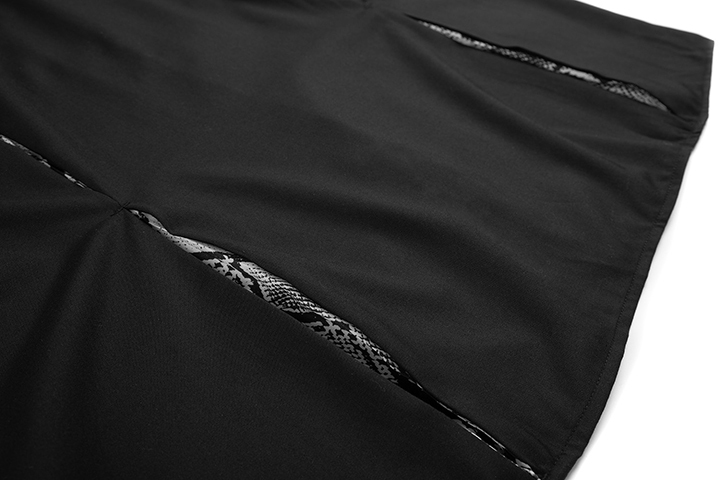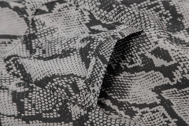 以特別開製的蛇紋布料、搭配局部拼接結合棗線等手法,
