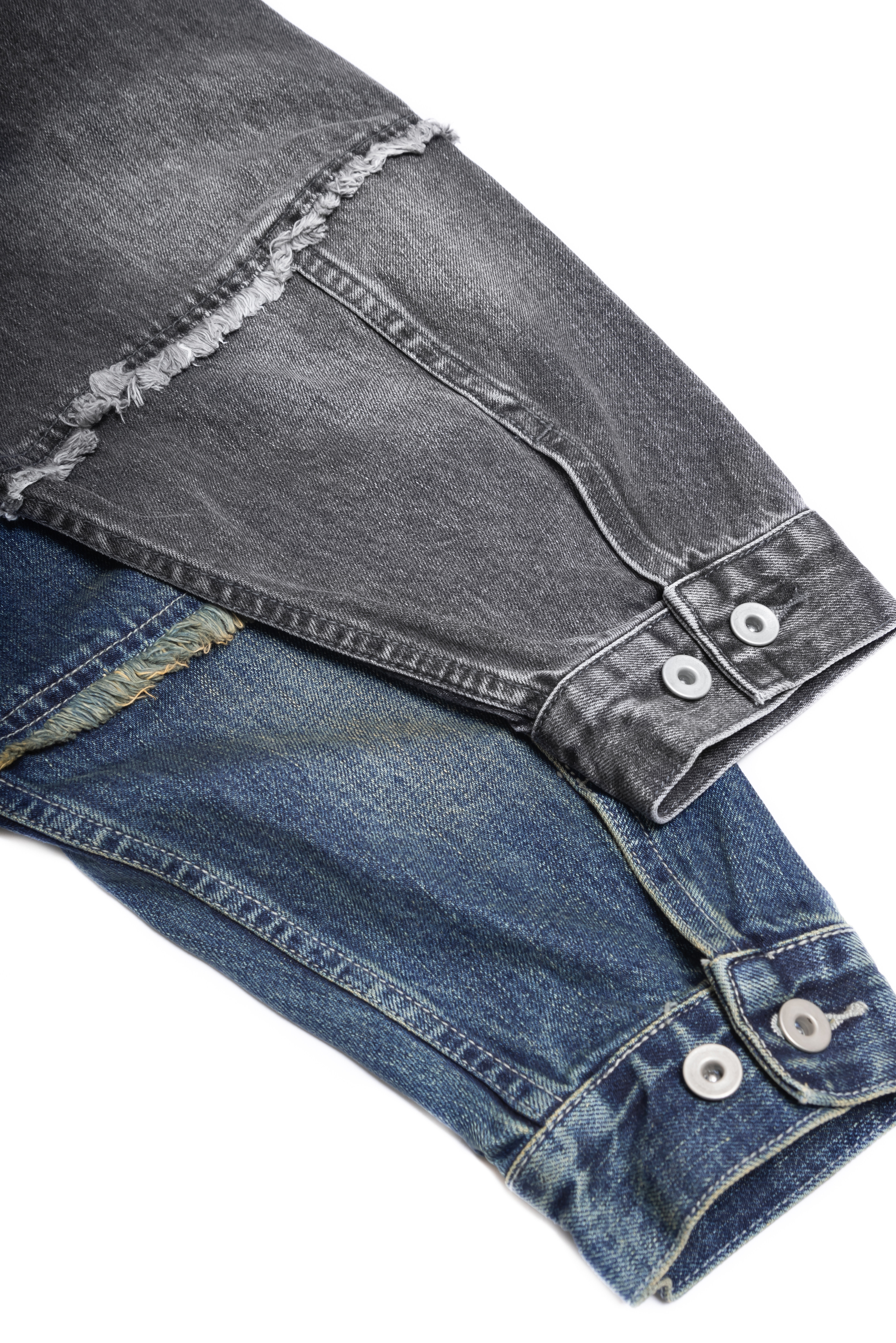 手袖安排剪接設計,搭配職人手工抽鬚細節,與舊化石洗的自然色落,